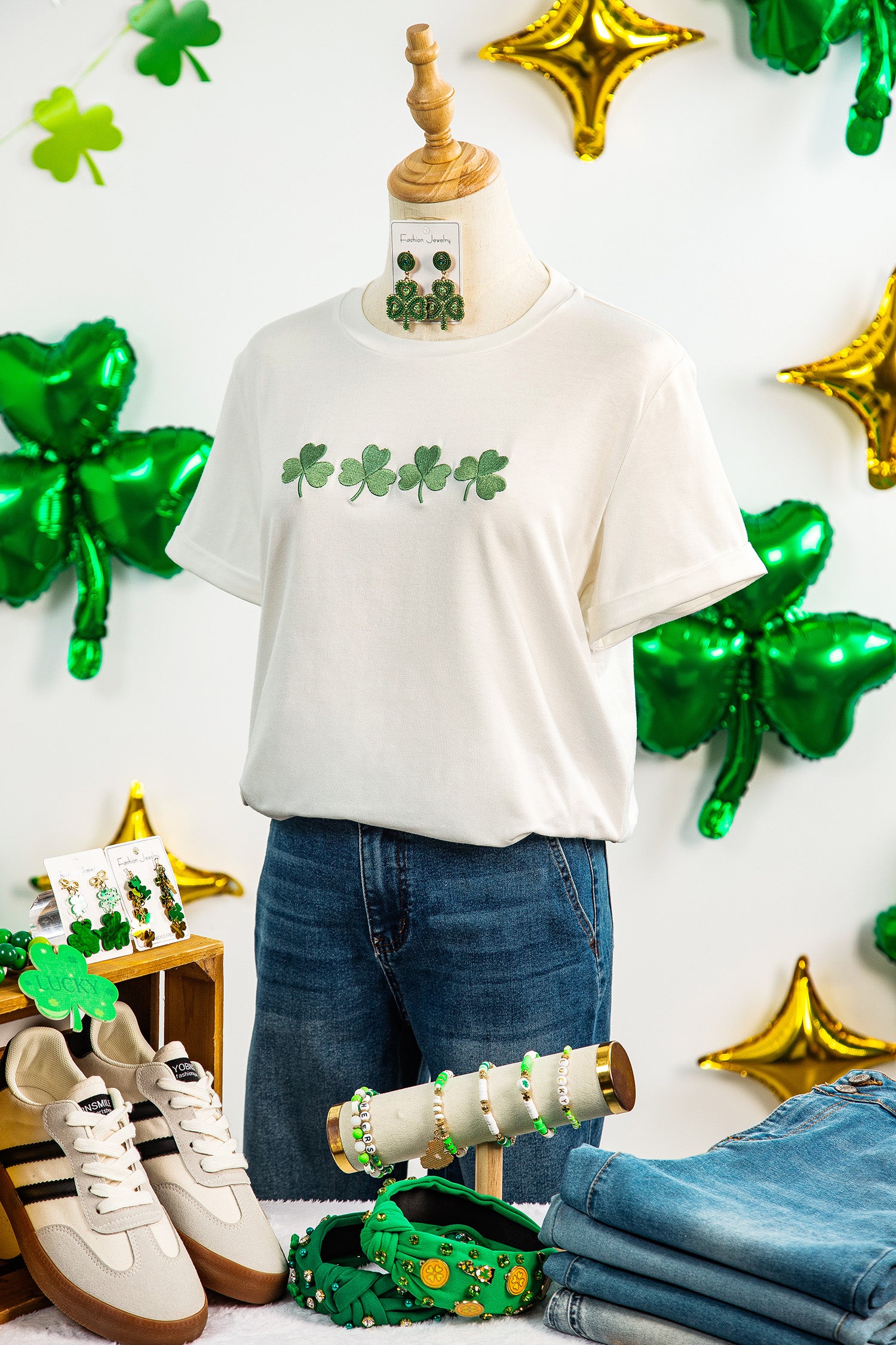 Embroidered Clover Tee – White St. Patrick’s Day Graphic Top